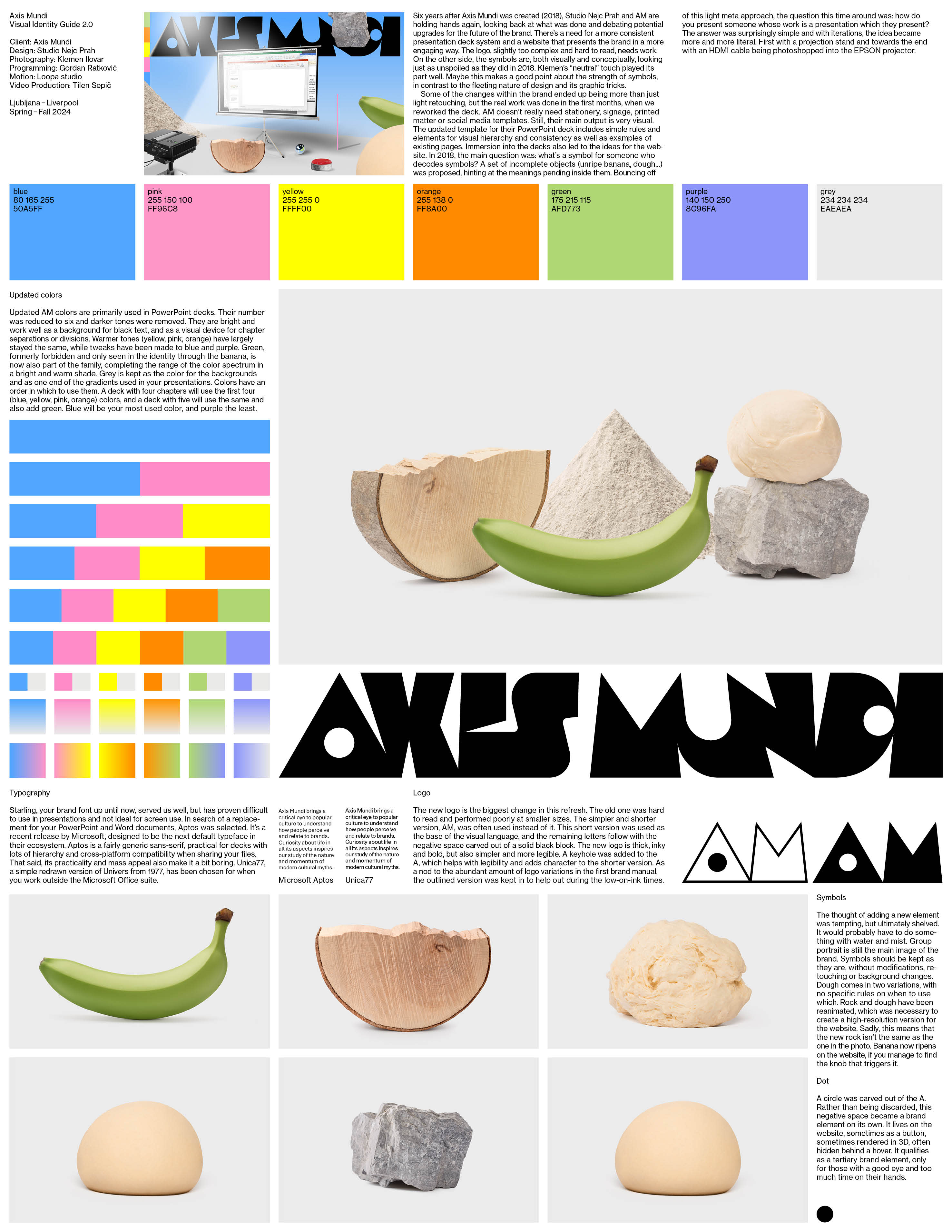 Axis Mundi is an independent culture advisory from the UK. The identity, first designed in 2018 and updated in 2025, is based on five symbols, a nod to their work with semiotics. These symbols sometimes occupy a visual environment, which was developed as an additional brand element used for more complex external communications. Identity includes an extensive design system for their PowerPoint decks, which led to the idea for their website, which presents them in the same manner.